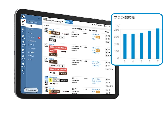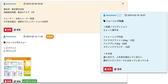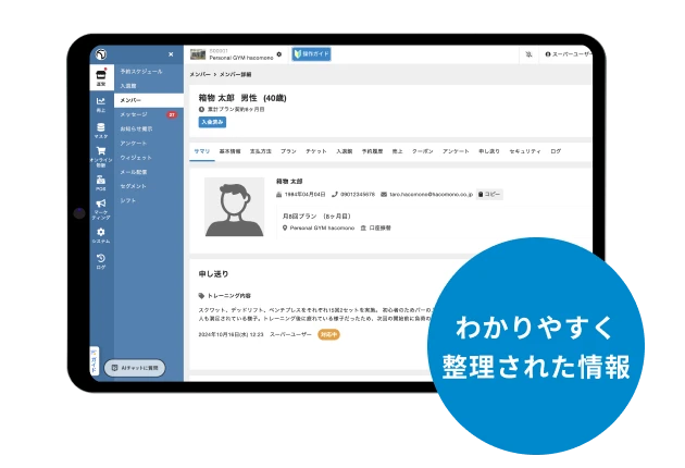 お客さまの属性や予約状況・決済情報と紐づけて一元管理できます。履歴を活用することで、個別の接客やトレーニングメニューの提案など、成果に繋げられます。