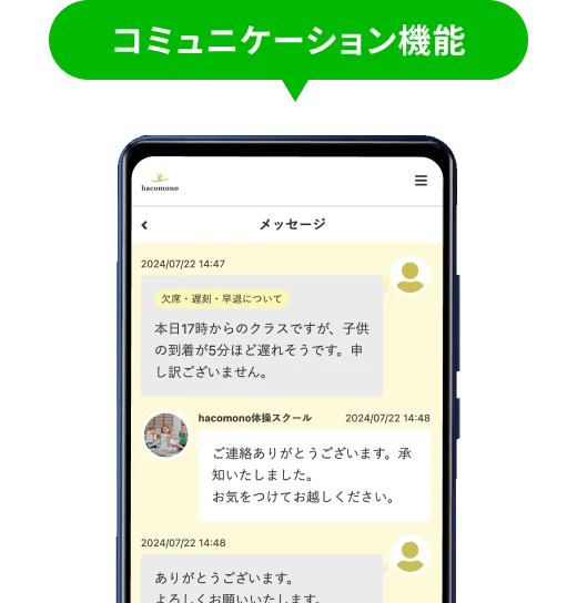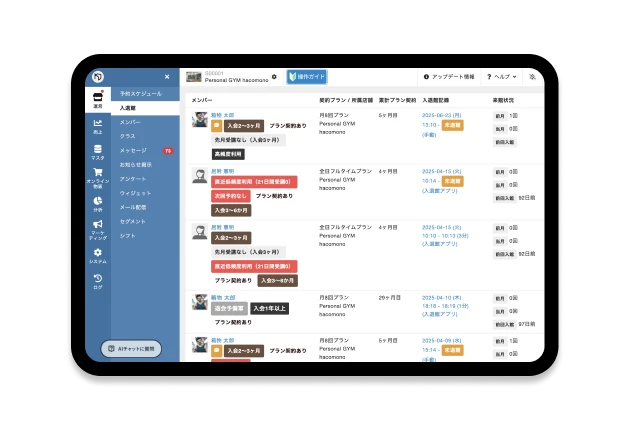 会員管理機能では、月謝会員だけでなく入会前の顧客管理まで可能です。基本情報だけでなく、これまでの契約履歴、来店・受講履歴、売上履歴、スタッフ間申し送り管理などが可能です。